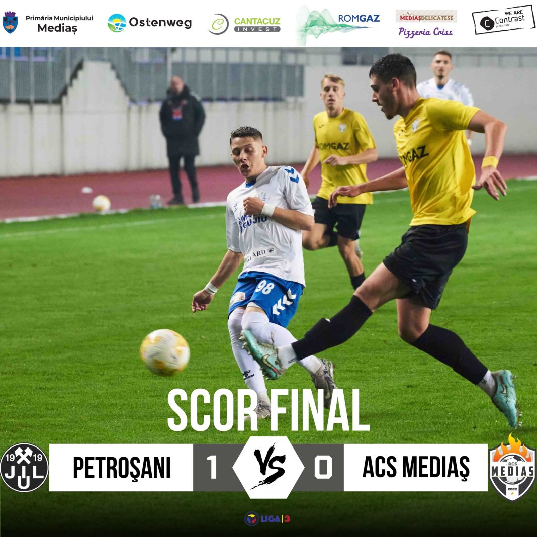 ACS Mediaș a pierdut la limită meciul disputat în deplasare pe terenul formației Jiul Petroșani, scor 1-0.