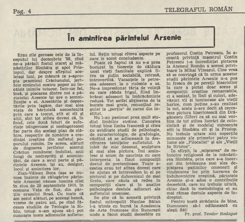 La mai puțin de o lună după prăbușirea regimului comunist, în 15 ianuarie 1990, în paginile ziarului Telegraful Român a apărut primul articol de presă dedicat părintelui Arsenie Boca, semnat de pr. prof. Teodor Bodogae. Textul, intitulat „În amintirea părintelui Arsenie”, reprezintă astăzi un document istoric de o valoare aparte: este prima evocare publică, liberă de cenzură, a vieții și personalității unuia dintre cei mai iubiți duhovnici ai secolului XX.