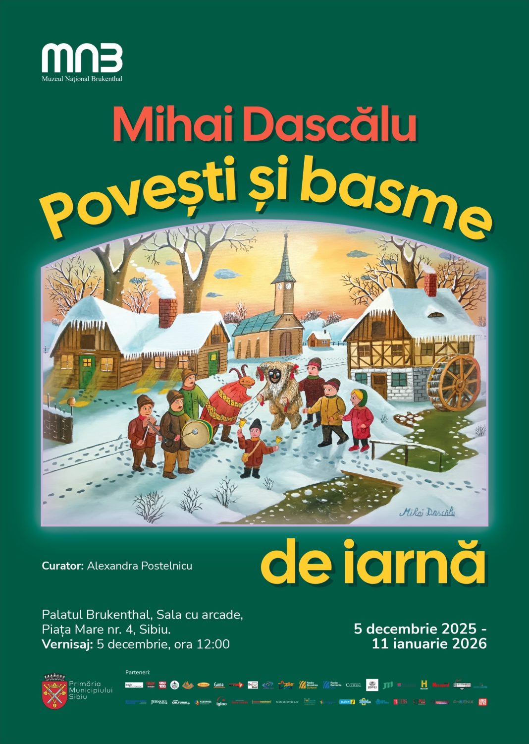 Muzeul Național Brukenthal găzduiește, în perioada 5 decembrie 2025 – 11 ianuarie 2026, expoziția „Mihai Dascălu. Povești și basme de iarnă”, un eveniment dedicat uneia dintre cele mai expresive și longevive voci ale artei naive din România. Expoziția este curatoriată de Alexandra Postelnicu, iar vernisajul va avea loc vineri, 5 decembrie, de la ora 12:00, în Sala cu arcade.