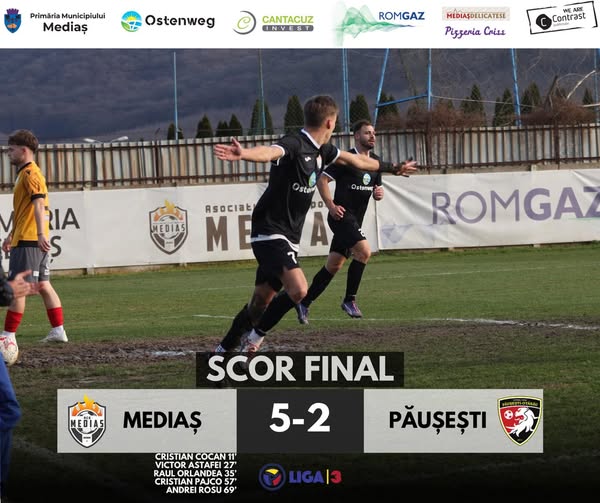 ACS Mediaș a oferit un spectacol fotbalistic pe teren propriu, impunându-se categoric în fața formației FC Păușești Otăsău, cu scorul de 5-2, într-un meci disputat în cadrul etapei a 16-a a Ligii a III-a, seria a VI-a.