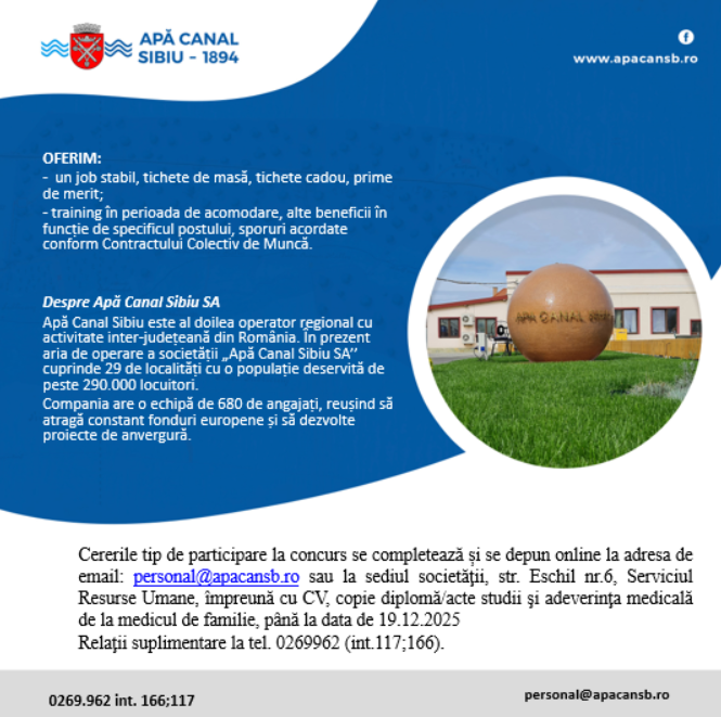 Cererile tip de participare la concurs se completează și se depun online la adresa de mail personal@apacansb.ro sau la sediul societăţii, str. Eschil nr.6, Serviciul Resurse Umane, împreună cu CV, copie diplomă studii şi adeverinţa medicală de la medicul de familie, până la data de 19.12.2025. Relaţii suplimentare la tel. 026922916 (int.117 sau 166).
