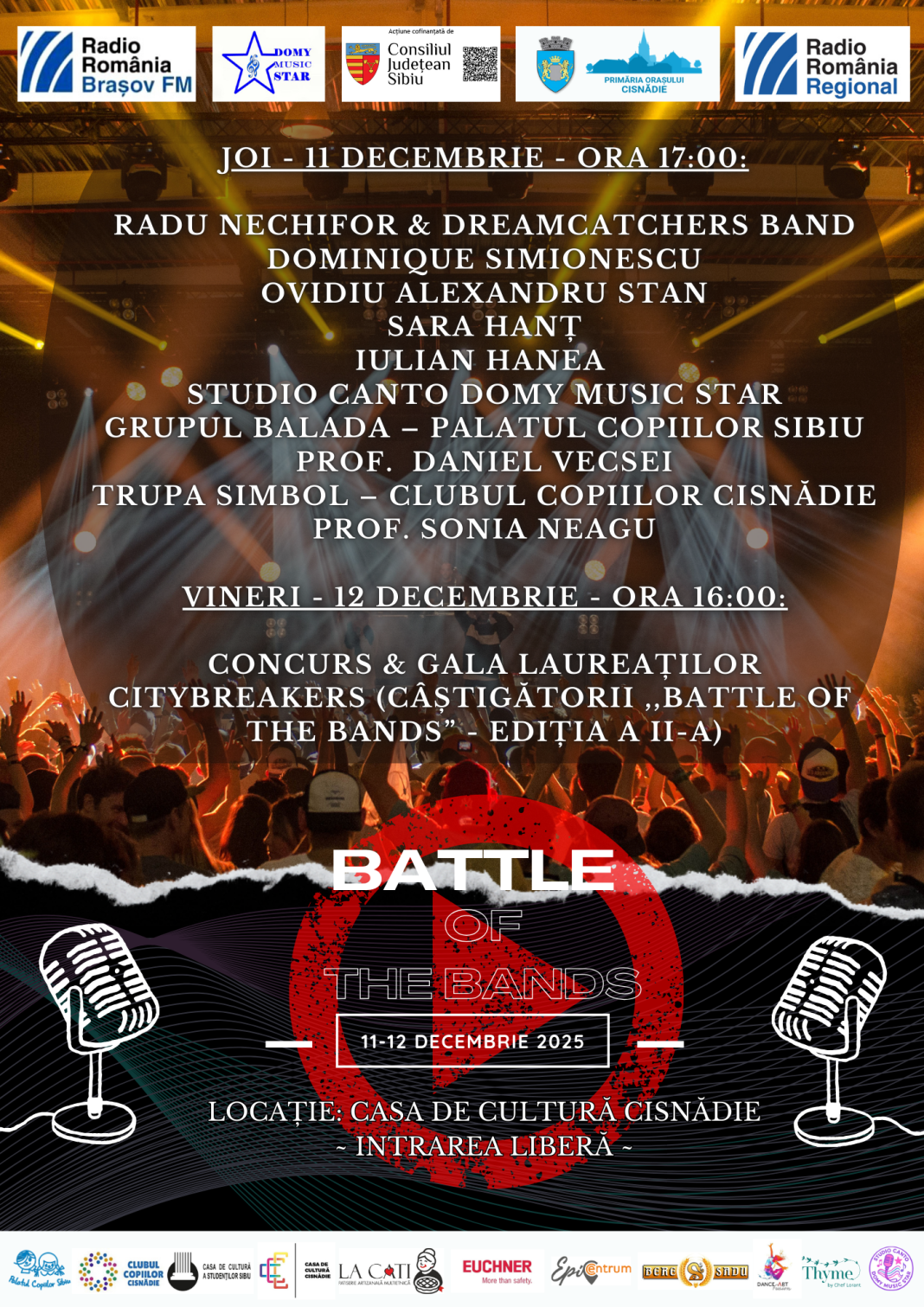 Cisnădia se pregătește să găzduiască, în 11 și 12 decembrie, una dintre cele mai așteptate competiții muzicale dedicate trupelor din România și anume Battle of the Bands. Evenimentul va avea loc la Casa de Cultură și este organizat de Asociația Domy Music Star și Radio România Brașov FM, cu sprijinul Primăriei Orașului Cisnădie și al Consiliului Județean Sibiu. Pe scenă vor urca formații și artiști talentați din județele Sibiu, Brașov și Covasna.