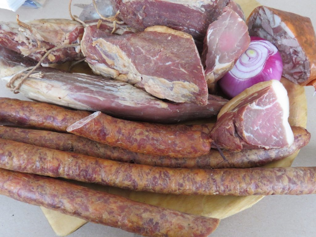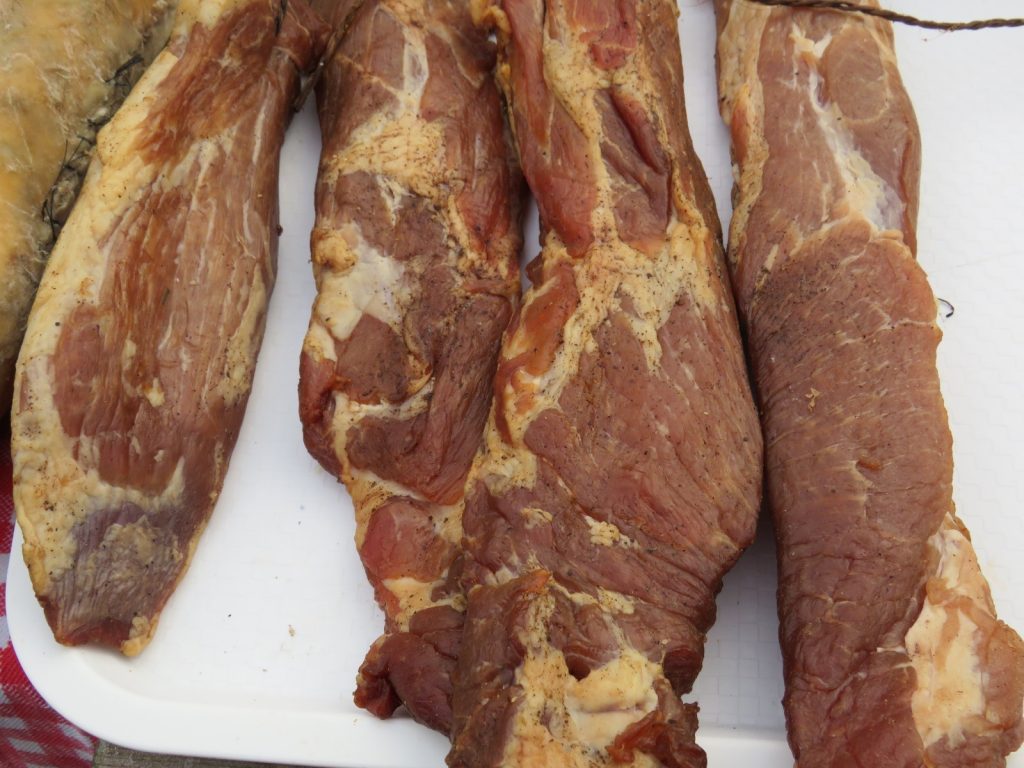 ,,[…]În ziua în care se tăia porcul, se preparau: cârnaţul, cârtaboşul şi pateul, sângeretele, jumările, untura topită, toba. Spetele, pulpile, peciile și slănina se lăsau cu sare câteva zile, apoi se zvântau bine și se puneau în pod sau în afumătoare pentru a se afuma. Când cârnațul și carnea erau afumate și dădeau să se usuce, o parte se prăjeau în bucăți mai mari și se puneau cu untură fierbinte, în garnițele sau în oalele de carne; iar cealaltă parte se consumau ca hrană rece sau se adăugau în mâncăruri. Din carnea din garniță sau de la oală se scoteau bucăți care erau baza unor altor mâncăruri ce se făceau din varză, fasole, cartofi. Oasele afumate dădeau gust la ciorbe sau la câte o mâncare de varză acră. Din picioare, urechi și șorici se făceau piftiile/ răcile, preparate la anul nou sau înainte de Bobotează atunci când era frig de crăpau pietrele.”