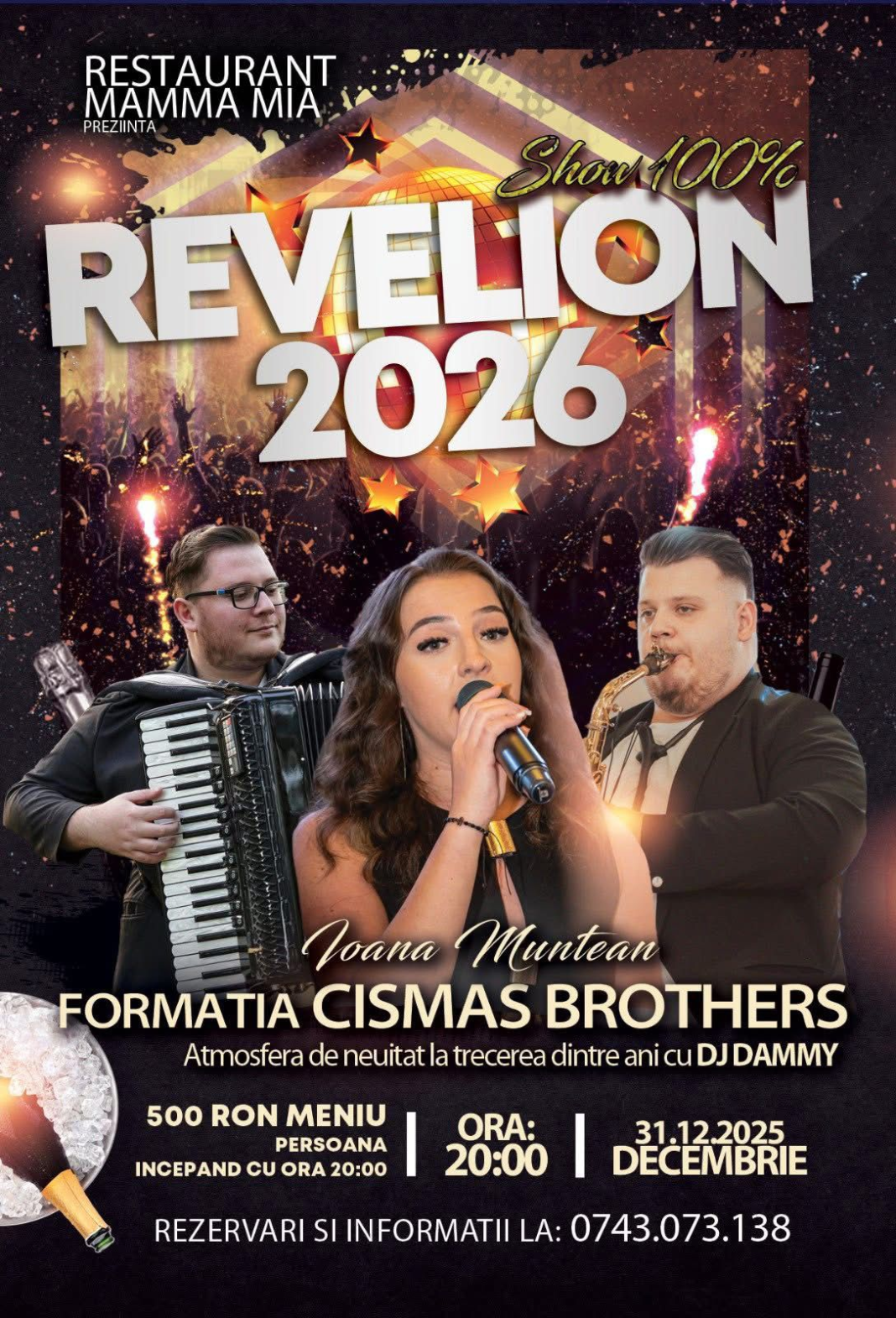 Evenimentul „Show 100% Revelion 2026” va avea loc în seara de 31 decembrie 2025, începând cu ora 20:00 și îi aduce pe scenă pe Ioana Muntean și Formația Cismaș Brothers, artiști cunoscuți pentru spectacolele lor pline de voie bună. Atmosfera va fi completată de DJ Dammy, care va menține ringul de dans animat până în primele ore ale noului an.