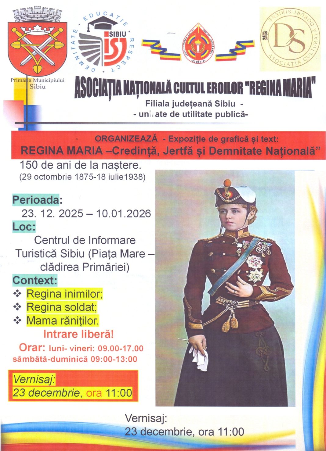 Asociația Națională Cultul Eroilor „REGINA MARIA” – Filiala Județeană Sibiu, în parteneriat cu Primăria Municipiului Sibiu, Inspectoratul Școlar Județean Sibiu și Asociația Culturală „Doruri Sibiene”, organizează expoziția documentară și comemorativă „REGINA MARIA – Credință, Jertfă și Demnitate Națională”, dedicată împlinirii a 150 de ani de la nașterea Reginei Maria.