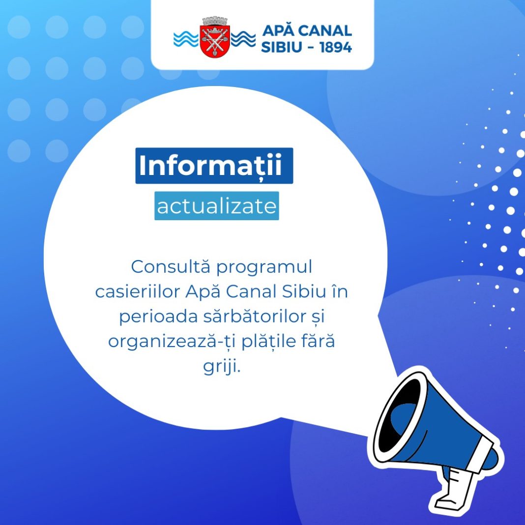 Pe măsură ce sărbătorile de iarnă se apropie, Apa Canal Sibiu S.A. își ajustează programul casieriilor pentru a veni în întâmpinarea clienților. Astfel, în zilele de 24 și 31 decembrie 2025, programul cu publicul va fi modificat după cum urmează: