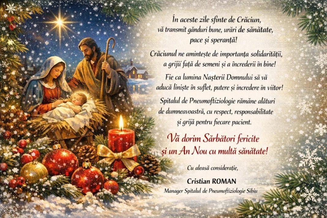 Mesajul este semnat de Cristian Roman, managerul Spitalului de Pneumoftiziologie Sibiu, care urează tuturor Sărbători fericite și un An Nou cu multă sănătate, în spiritul păcii și al speranței pe care Crăciunul le aduce în fiecare an.