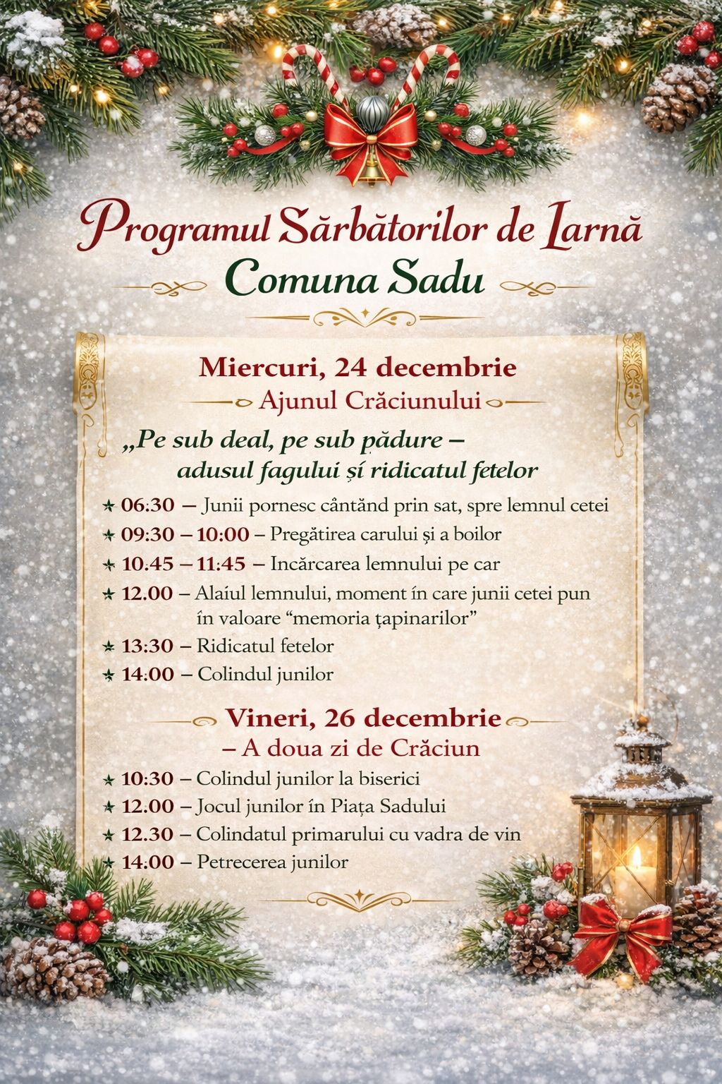 Crăciunului și să păstrăm vii tradițiile care ne unesc! Sărbători binecuvântate și un An Nou plin de sănătate, lumină și bucurii!”- a transmis primarul comunei Sadu, Valentin Ivan