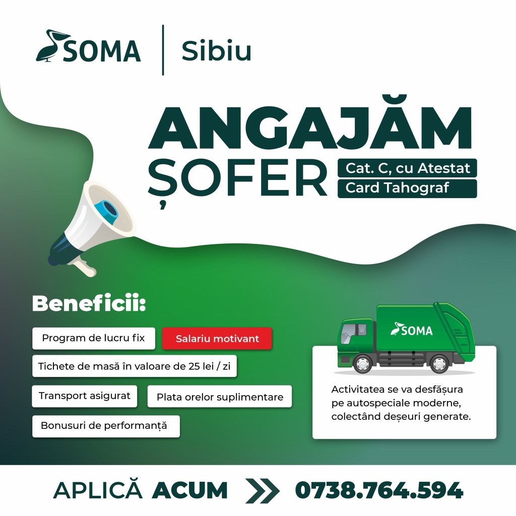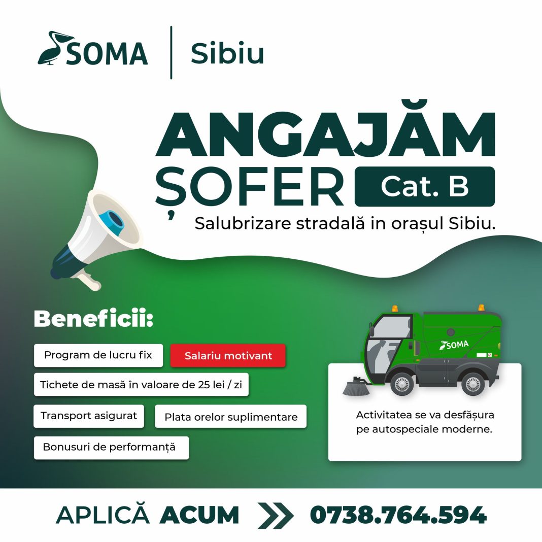 SOMA Salubrizare – Zona Sibiu lansează, în prag de sărbători, două noi oportunități de angajare, adresate persoanelor care își doresc un loc de muncă stabil și un nou început profesional la final de an.