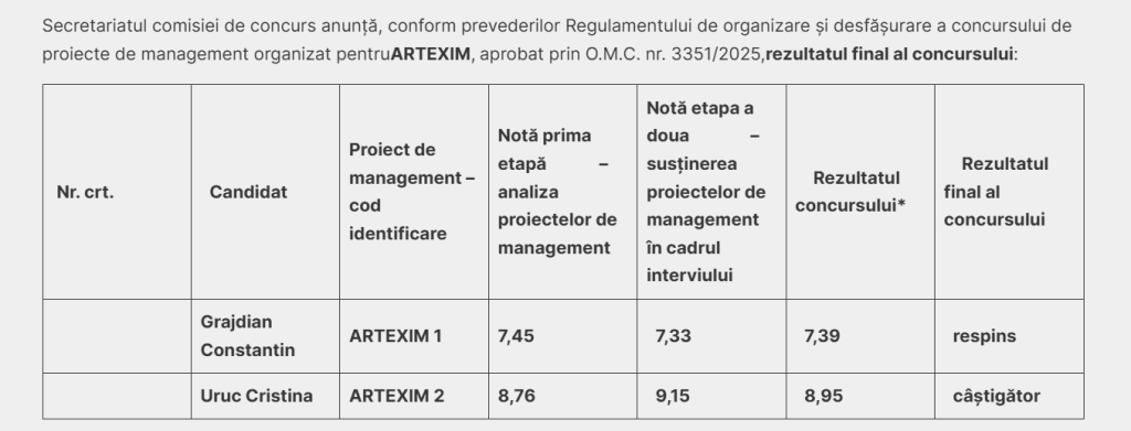 Ministerul Culturii a publicat rezultatele finale ale concursului de proiecte de management organizat pentru conducerea instituției ARTEXIM, agenție publică responsabilă de organizarea Festivalului și Concursului Internațional „George Enescu”, evenimente de tradiție în peisajul cultural românesc și internațional.