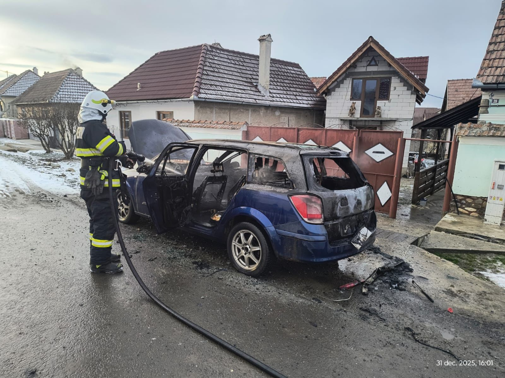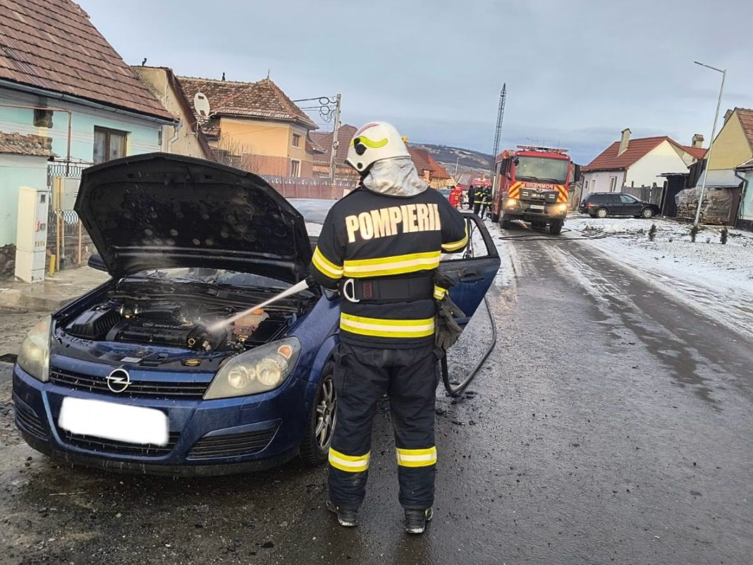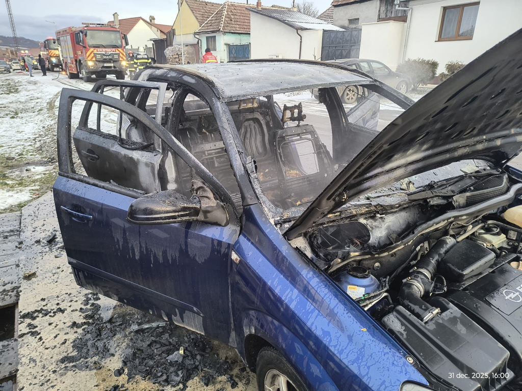 O mașină parcată a luat foc în Miercurea Sibiului. Pompierii s-au deplasat de urgență la locul incendiului.