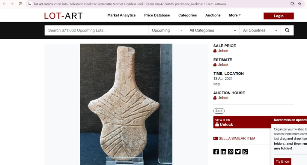 În zona agregatoarelor, Lot-Art listează un „Vinča Double-Headed Idol”, cu proveniență „Wedemeyer collection; acquired in the 1970s”. Și aici apare aceeași problemă: o etichetă de colecție veche poate fi reală, dar nu înlocuiește documentele care ar clarifica proveniența inițială. (LOT-ART)