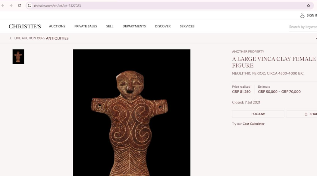 La Christie’s, un lot Vinča (figură masculină așezată) are o proveniență care indică „colecție privată, Olanda, achiziționată în anii 1960”, apoi o vânzare anterioară la Christie’s Londra în 2013. Pentru un alt lot Vinča (figură feminină în picioare), proveniența menționată este „with Dr. Elie Borowski, Basel, prior to 1975”. Aceste repere sunt importante, dar nu lămuresc automat dacă ieșirea din țara de origine s-a făcut legal sau dacă există un lanț complet de documente. (onlineonly.christies.com)