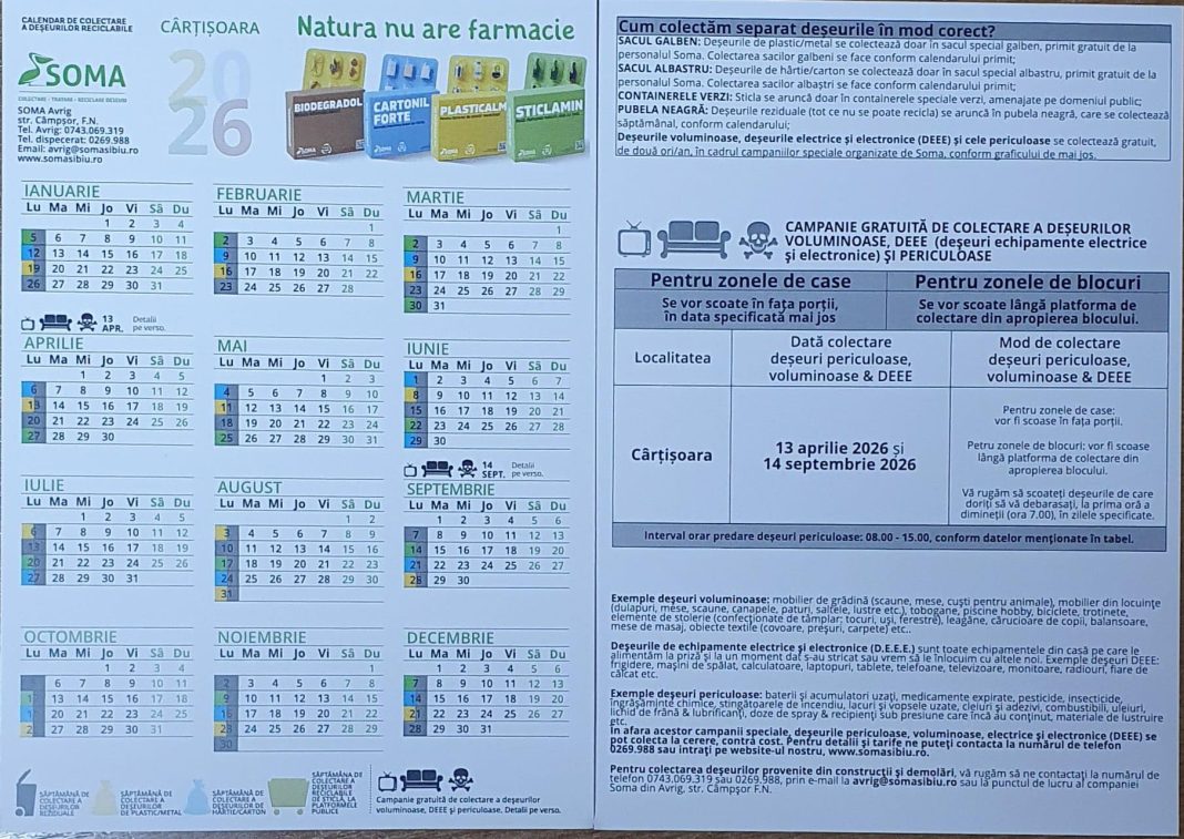 Calendarul de colectare a deșeurilor pentru 2026 este disponibil pe canalele oficiale ale Primăriei Cârțișoara și poate fi consultat de toți cetățenii interesați.