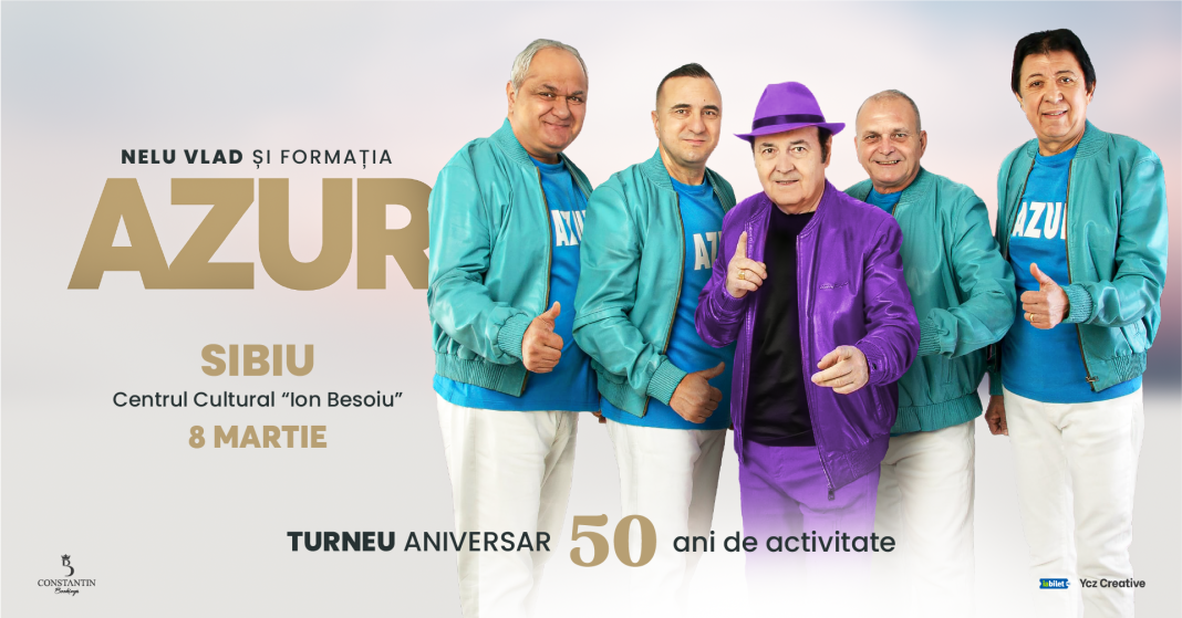 Sibienii sunt invitați la un eveniment muzical de excepție, dedicat uneia dintre cele mai longevive și iubite formații din România. Pe 8 martie 2026, Nelu Vlad și Formația Azur vor urca pe scena Centrul Cultural Ion Besoiu, în cadrul Turneului Aniversar „50”, un spectacol care marchează cinci decenii de carieră muzicală.