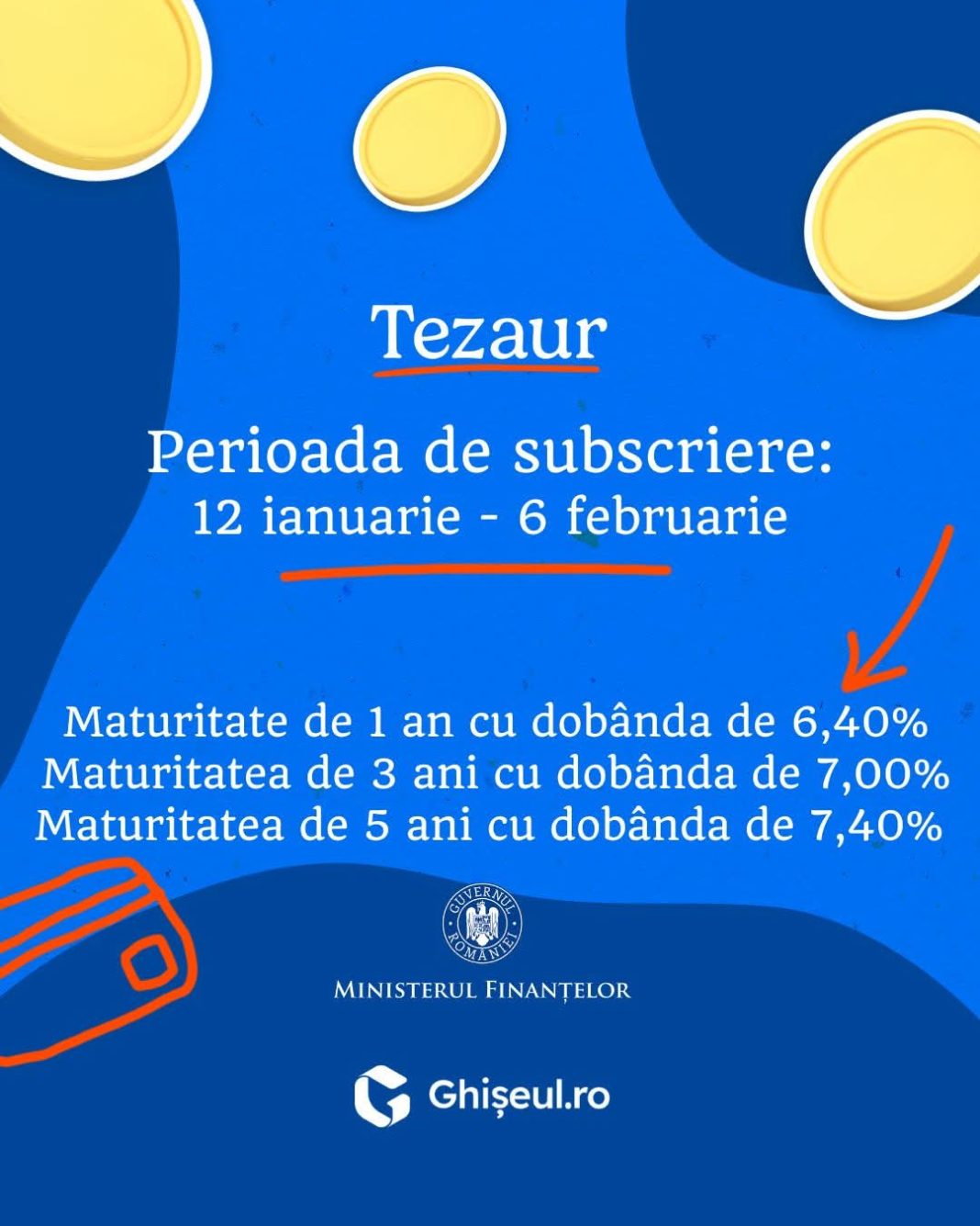 Românii pot investi, în perioada 12 ianuarie – 6 februarie 2026, în titluri de stat cu maturități de 1, 3 și 5 ani, care oferă dobânzi de 6,40%, 7% și, respectiv, 7,40%. Titlurile au valoare nominală de 1 leu, sunt emise în formă dematerializată, iar veniturile obținute nu sunt supuse impozitării.