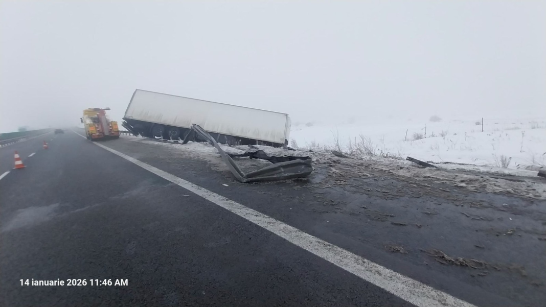 Un TIR s-a răsturnat pe autostrada A1, între Săliște și Apoldu de Jos: Traficul este restricționat!