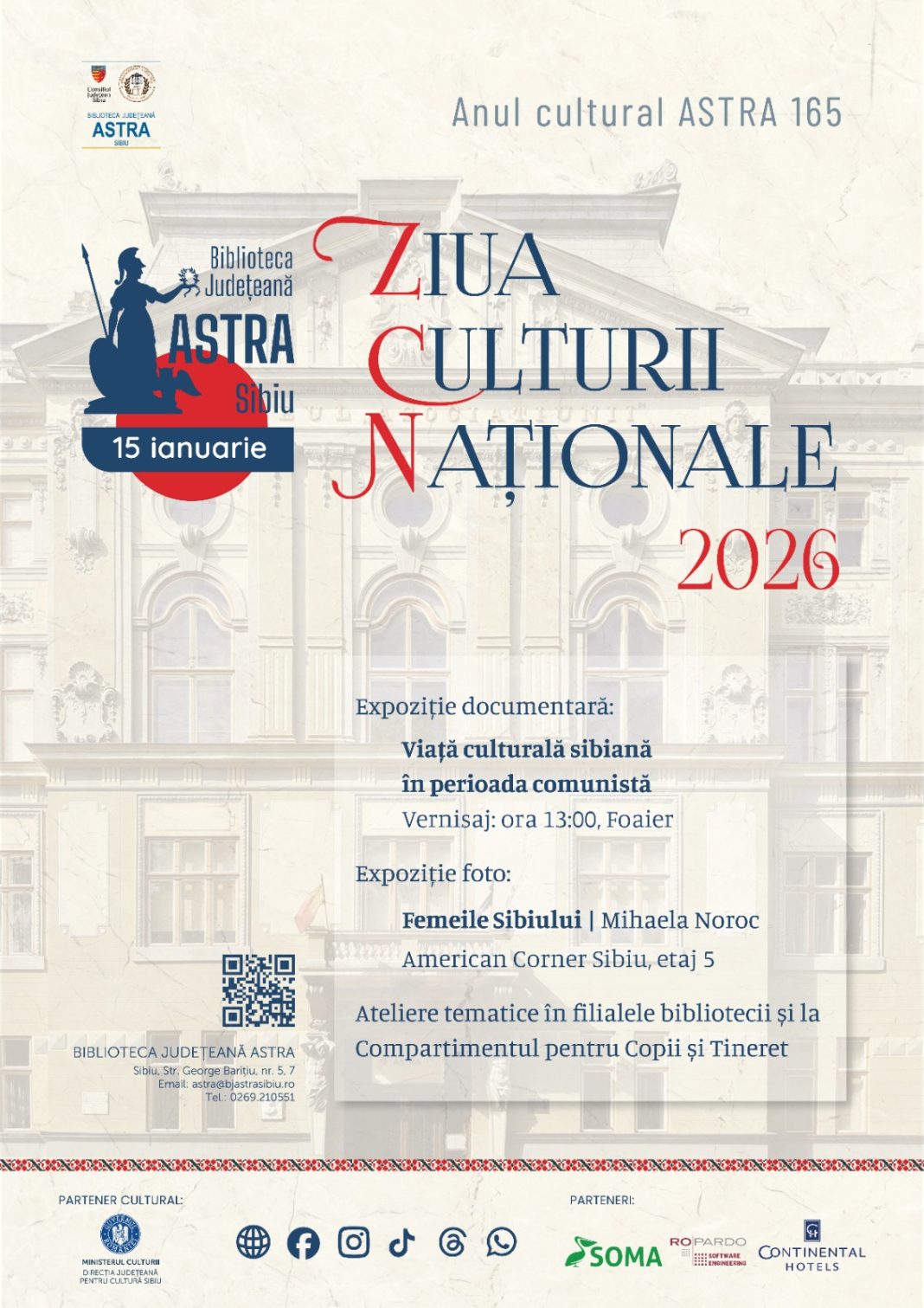 Biblioteca Județeană ASTRA Sibiu marchează Ziua Culturii Naționale 2026 printr-o serie de evenimente culturale dedicate publicului larg, desfășurate sub egida Anului Cultural ASTRA 165, care celebrează 165 de ani de la înființarea Asociațiunii Transilvane pentru Literatura Română și Cultura Poporului Român (ASTRA).