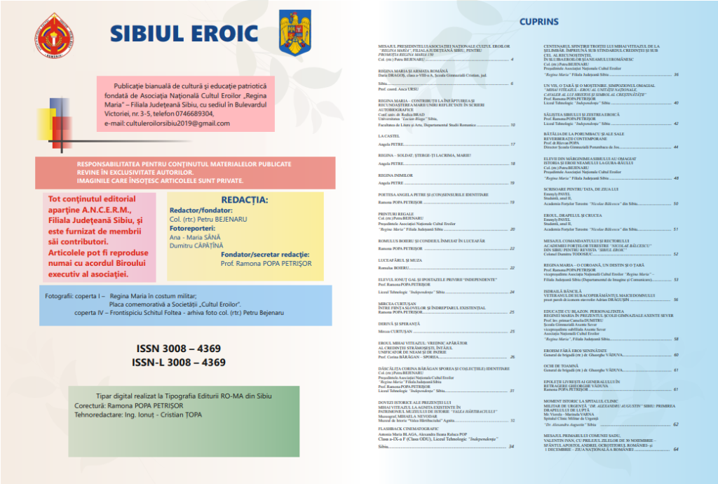 A apărut un nou număr al revistei „Sibiul Eroic”, publicație de cultură și educație patriotică editată de Asociația Națională Cultul Eroilor „Regina Maria” – Filiala Județeană Sibiu, care continuă demersul de cinstire a eroilor neamului românesc și de promovare a valorilor identitare fundamentale.