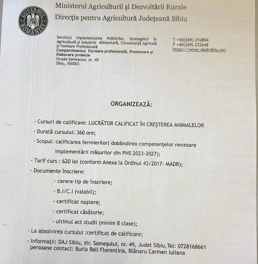 Primăria comunei Cârțișoara aduce la cunoștința fermierilor și crescătorilor de animale din localitate că Direcția pentru Agricultură Județeană Sibiu, prin Ministerul Agriculturii și Dezvoltării Rurale, organizează cursuri de calificare pentru „Lucrător calificat în creșterea animalelor”.