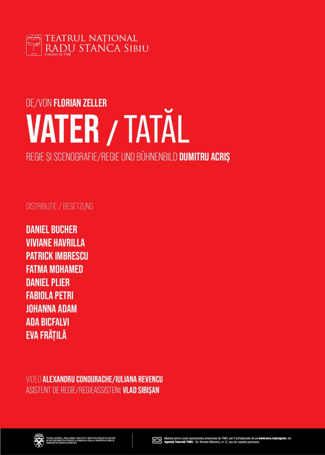 Teatrul Național „Radu Stanca” Sibiu prezintă premiera spectacolului „Vater” / „Tatăl” de Florian Zeller, în regia lui Dumitru Acriș, o producție a Secției germane. Avanpremiera are loc în 5 februarie, iar premiera este programată în 6 februarie, de la ora 19:00, la Sala Mare.