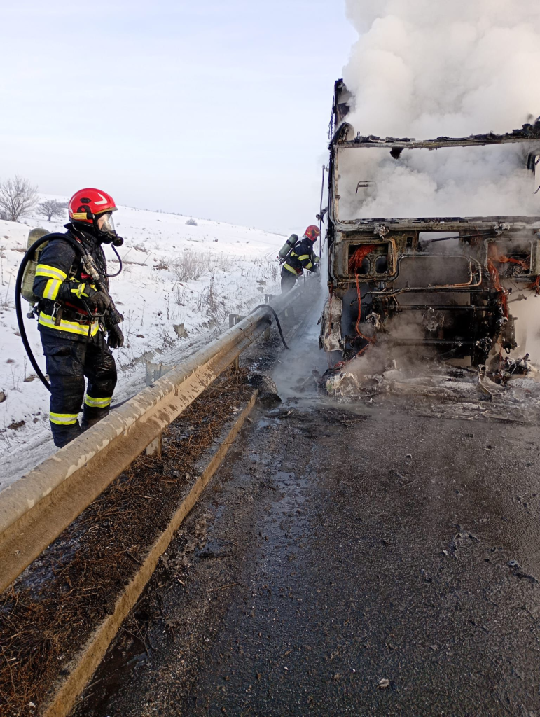La sosirea pompierilor, incendiul se manifesta generalizat la capul tractor, fiind deja extins și la remorcă. Pompierii acționează acum pentru stingerea focului, iar misiunea este în plină desfășurare.