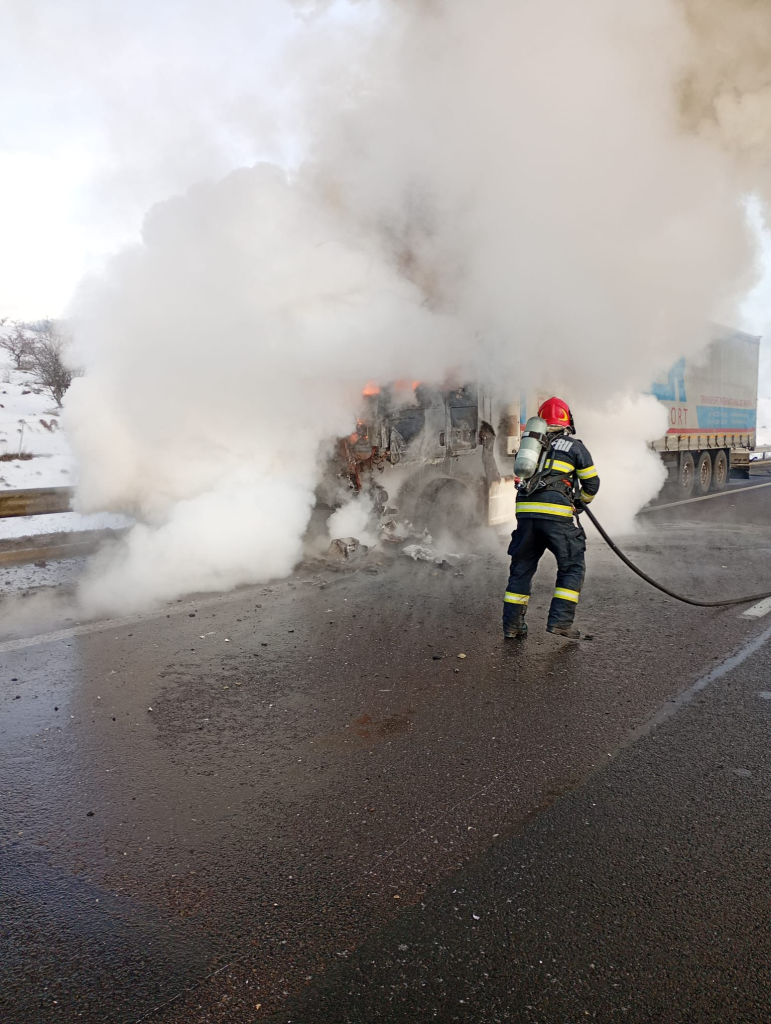 Un TIR a luat foc în această dimineață pe Autostrada A1, în zona localității Săliște. La locul incendiului s-au deplasat de urgență trei autospeciale de stingere și un echipaj SMURD.