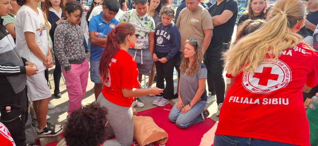 Instructorii și voluntarii Crucii Roșii Sibiu au susținut sesiuni de pregătire în grădinițe, școli, licee și unități de producție din întreg județul, unde participanții au învățat manevre esențiale pentru salvarea vieții în caz de pierdere a conștienței, hemoragii, arsuri, stop cardio-respirator, fracturi sau blocarea căilor respiratorii.