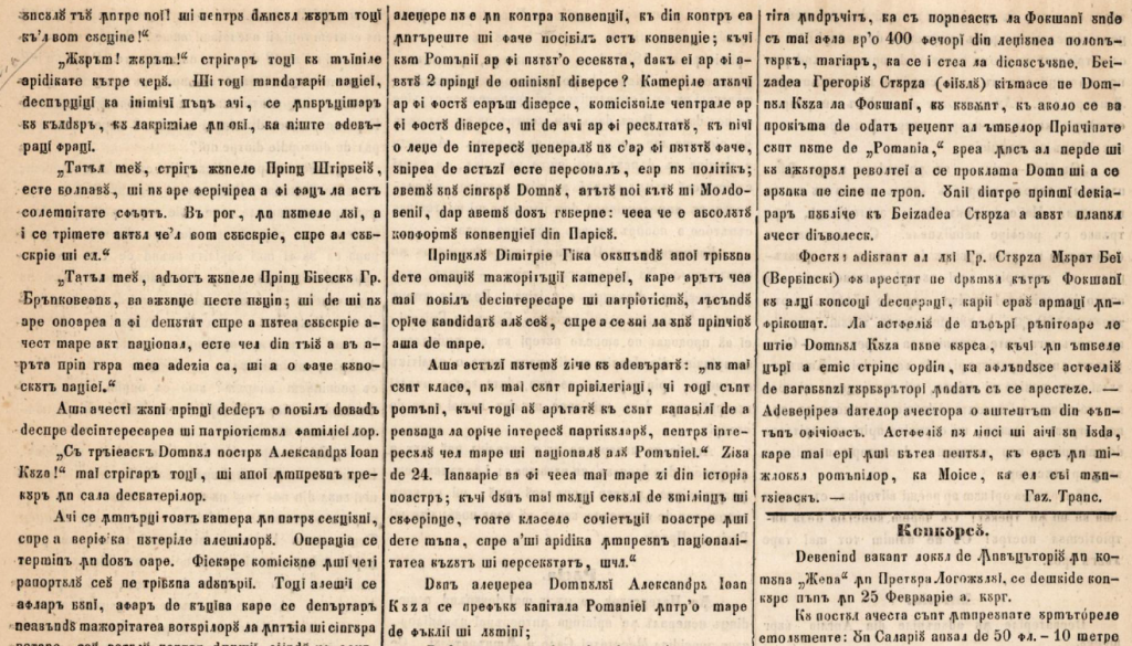 Alegerea lui Alexandru Ioan Cuza este prezentată ca rezultatul unei renunțări colective la interesele de partid în favoarea unui ideal superior. Cuvintele rostite în Adunare sunt însoțite de imagini puternice: „toți mandatarii nației, despărțiți ca inimici pănă aci, se îmbrățișară cu lacrimile în ochi, ca niște adevărați frați”. Pentru cititorul transilvănean, aceste rânduri au valoarea unei lecții politice și morale.