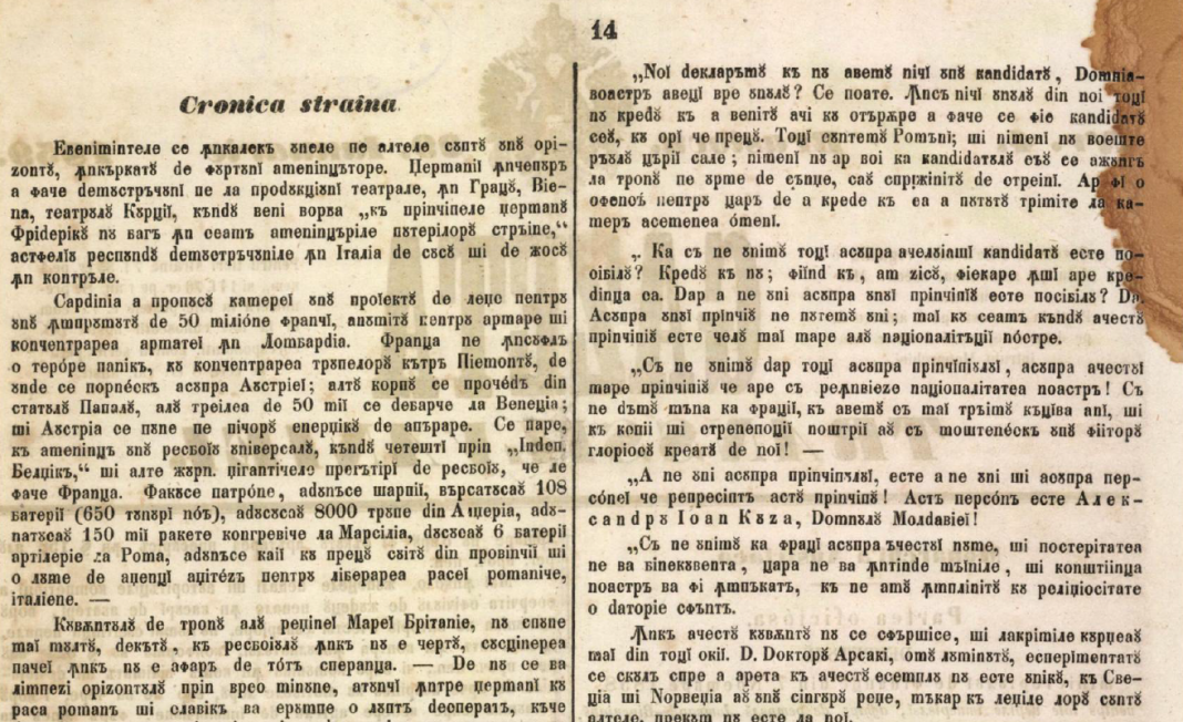 Relatarea alegerii lui Cuza din Telegraful Român (1859) pune accentul pe atmosfera dramatică și emoționantă din Adunarea Electivă. Ziarul descrie ruptura inițială dintre taberele politice și pericolul anarhiei, pentru ca apoi să surprindă momentul decisiv al împăcării. Un fragment revelator redă spiritul zilei: „Pentru ce ne zicemu noi și voi? Au nu suntemu toți Români! Au nu avem toți aceași Patrie?”.