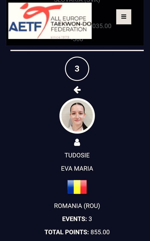 Pe locul 3 în clasamentul Federației Europene de Taekwon-do ITF, o regăsim la proba de spargeri forță junioare feminin pe sportiva Eva Maria Tudosie, legitimată la Puma Club Sibiu. Eva a acumulat până în prezent 855 de puncte. Campionatul European din acest an ar putea aduce alte puncte valoroase.