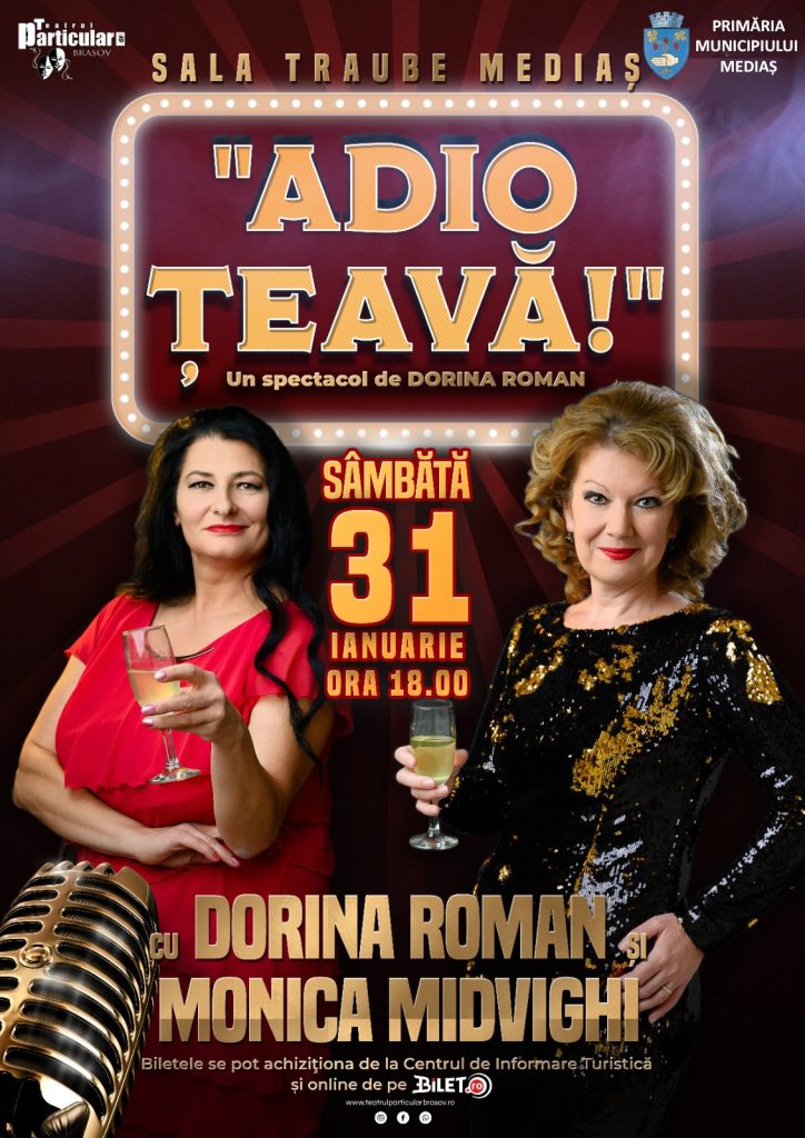 Sâmbătă, 31 ianuarie 2026, începând cu ora 18:00, Teatrul Particular Brașov va prezenta piesa de teatru „Adio, țeavă!”, cu Dorina Roman și Monica Midvighi. Spectacolul este o comedie romantică ce abordează, într-o manieră plină de umor, teme precum prietenia, trădarea și iubirea. Biletele pot fi achiziționate de la Centrul de Informare Turistică, situat pe strada Nicolae Iorga nr. 2, precum și online.