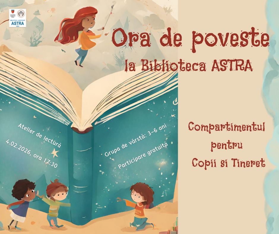 Biblioteca ASTRA Sibiu îi invită pe cei mai mici iubitori de lectură la o nouă ediție a îndrăgitului eveniment „Ora de poveste”, un prilej de bucurie, imaginație și descoperire a lumii fascinante a cărților.
