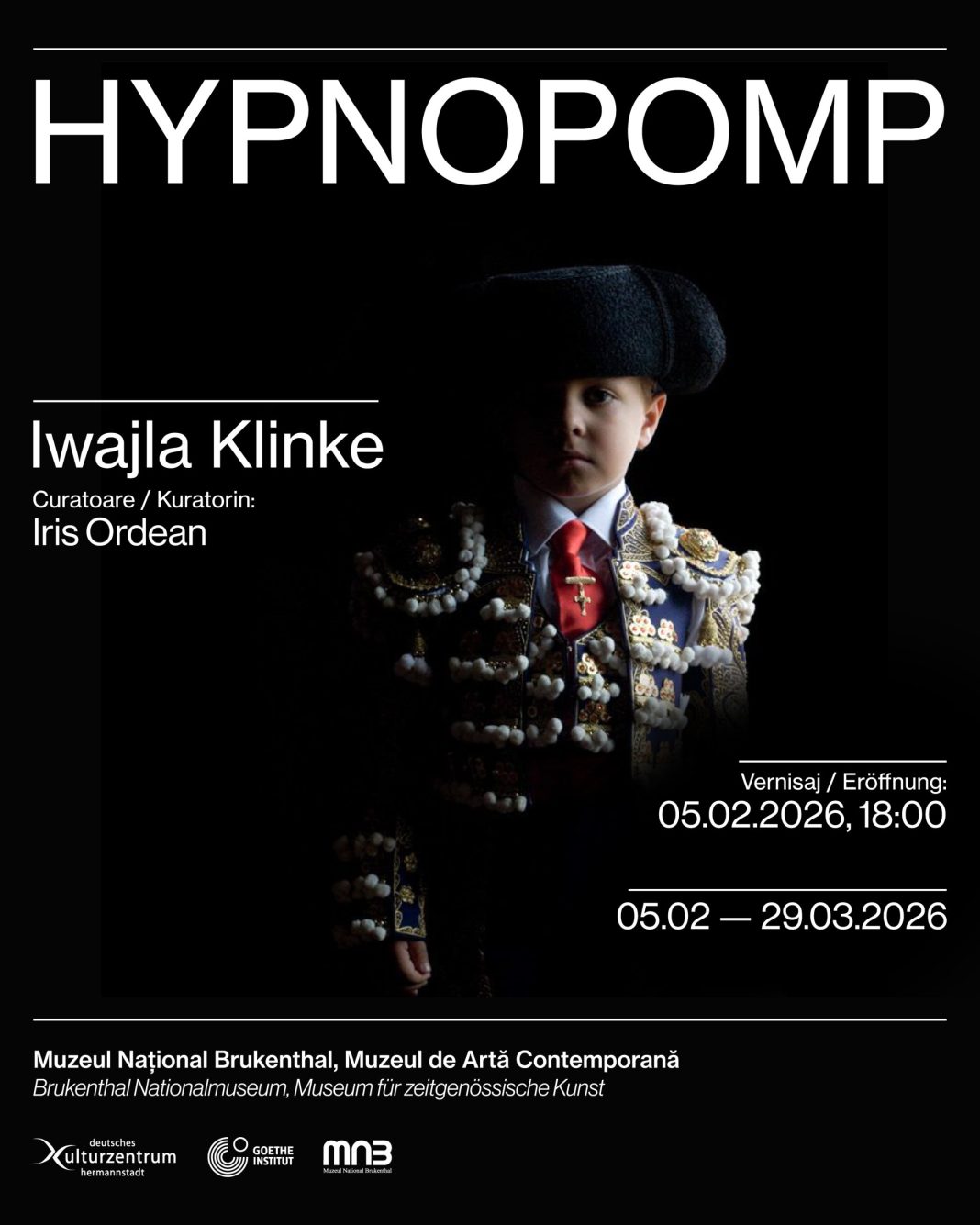 Muzeul Național Brukenthal inaugurează anul expozițional 2026 la Muzeul de Artă Contemporană prin expoziția „HYPNOPOMP”, semnată de artista germană Iwajla Klinke și curatoriată de Iris Ordean. Vernisajul va avea loc joi, 5 februarie 2026, de la ora 18:00, la sediul de pe Strada Tribunei nr. 6, cu acces gratuit.