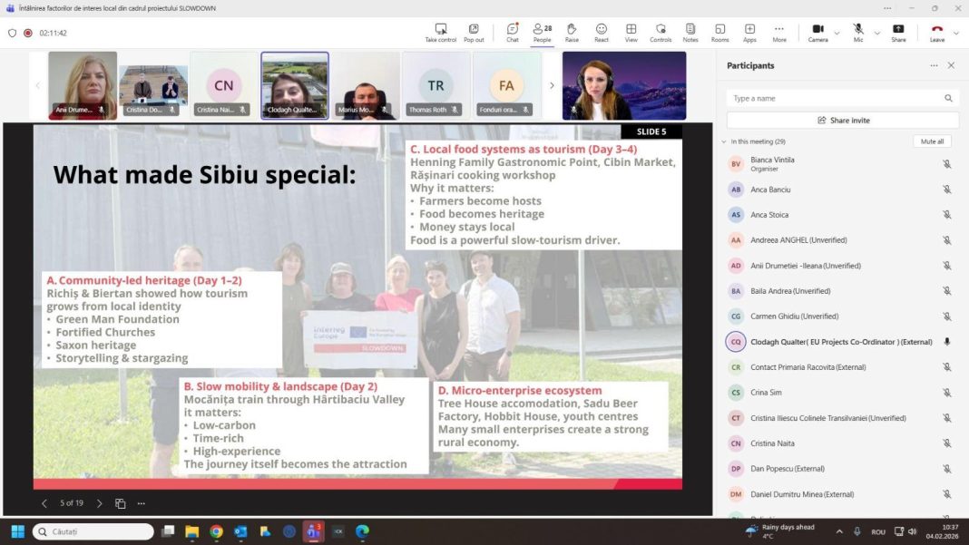 Consiliul Județean Sibiu a organizat o nouă întâlnire online în cadrul proiectului european Slowdown – Interreg Europe, dedicată schimbului de bune practici în domeniul turismului lent și ecoturismului. La discuții au participat primari, reprezentanți ai autorităților locale, operatori turistici și organizații care promovează ecoturismul în județul Sibiu.
