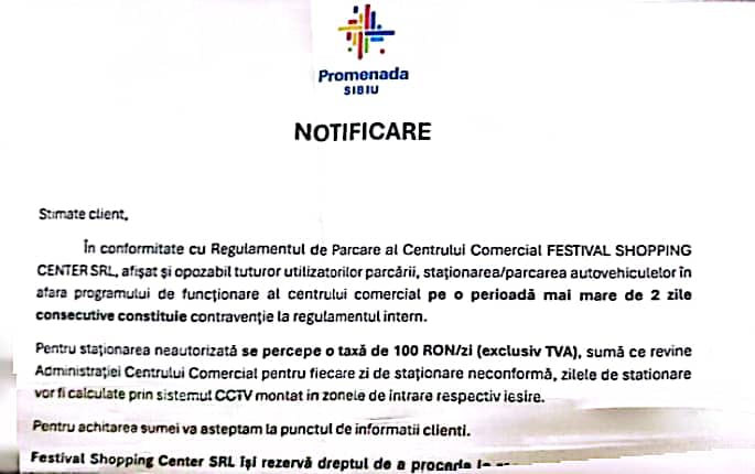 Clienții centrului comercial Promenada Sibiu trebuie să fie mult mai atenți la durata în care își lasă autovehiculele în parcarea mall-ului. Administrația spațiului comercial a început aplicarea unor reguli stricte pentru a descuraja folosirea spațiului pe post de parcare pe termen lung.