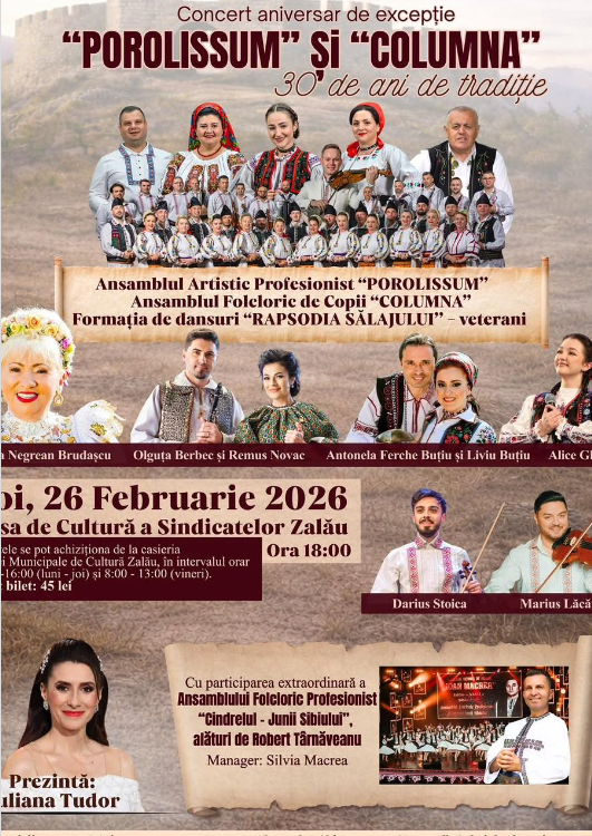 Zalăul devine, joi, 26 februarie 2026, de la ora 18:00, capitala folclorului românesc, odată cu organizarea unui spectacol aniversar de excepție dedicat împlinirii a 30 de ani de activitate a Ansamblurilor „Porolissum” și „Columna”. Evenimentul va avea loc la Casa de Cultură a Sindicatelor Zalău și va fi prezentat de cunoscuta realizatoare TV Iuliana Tudor.