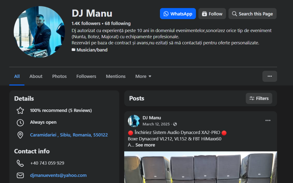 Datele de contact ale firmei coincid cu cele utilizate de un DJ din Sibiu. În contract, la datele prestatorului, este menționat un număr de telefon mobil, dar pe siteul ANAF la contact apare alt număr de telefon, care coincide cu cel prezentat public de DJ Manu (Emanuel Burcea), care promovează servicii pentru evenimente private (nunți, botezuri, majorate).