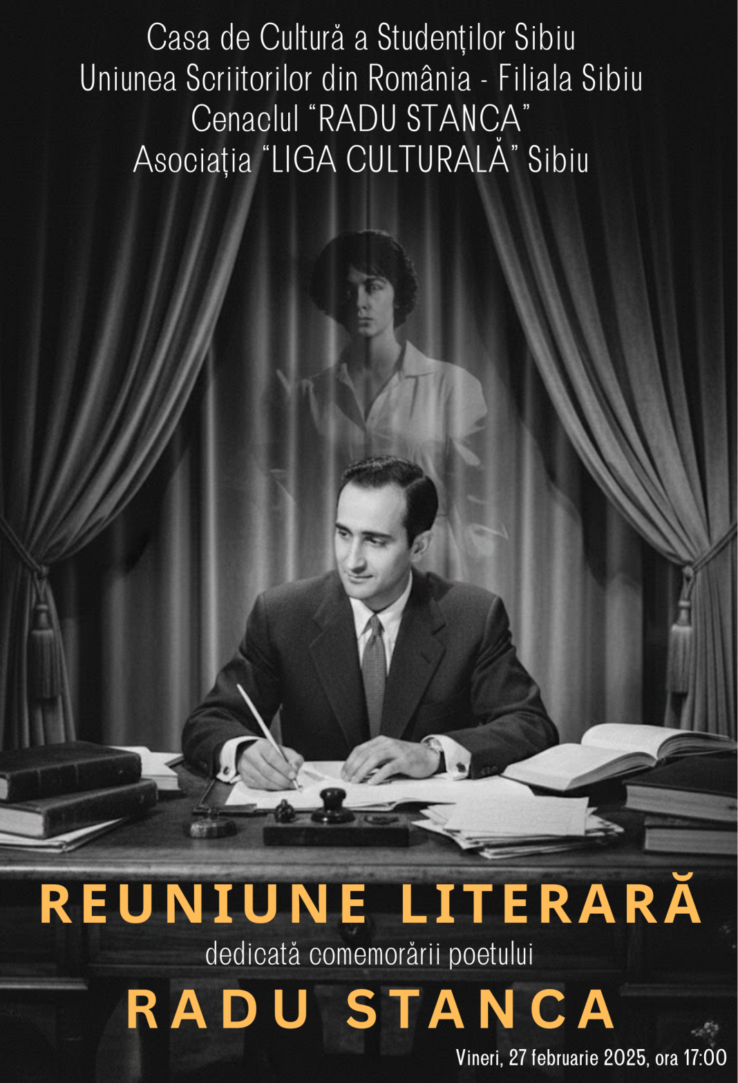 Casa de Cultură a Studenților Sibiu, alături de Uniunea Scriitorilor din România – Filiala Sibiu, Cenaclul „Radu Stanca” și Asociația „Liga Culturală Sibiu”, organizează vineri, 27 februarie 2026, de la ora 17:00, o reuniune literară dedicată comemorării poetului Radu Stanca. Evenimentul va avea loc la sediul instituției de pe Calea Dumbrăvii nr. 34A.