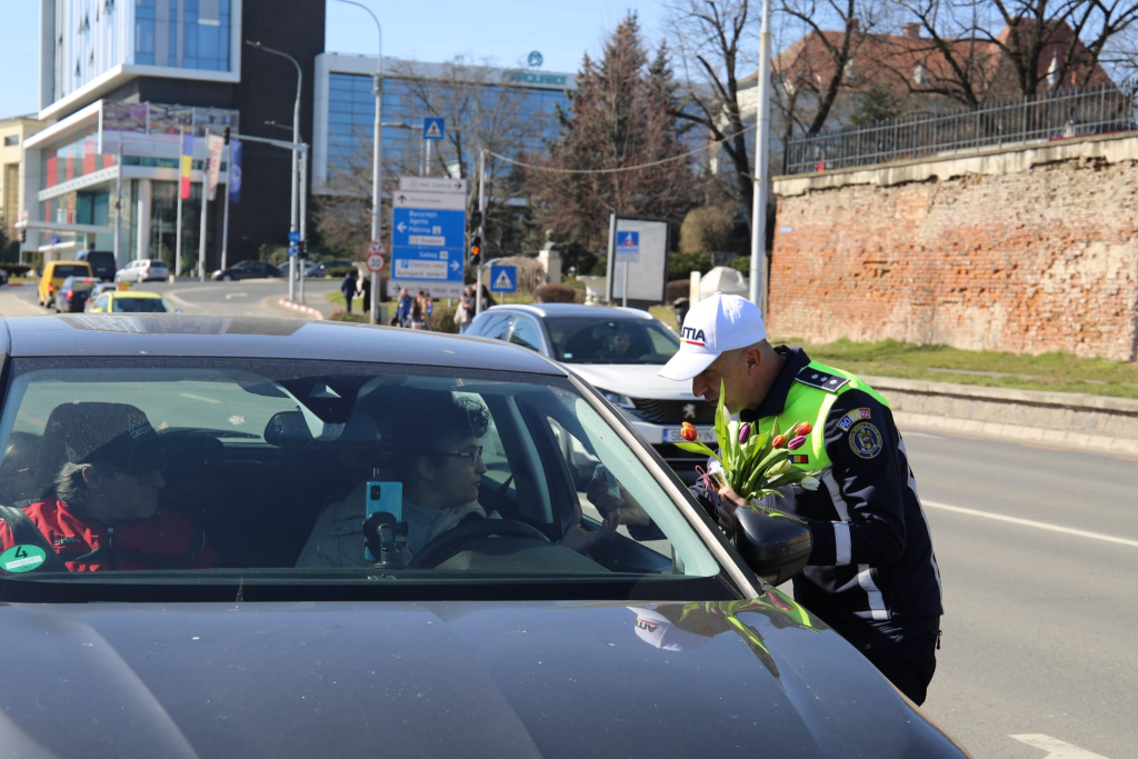 În loc de documente la control și sancțiuni, șoferițele trase pe dreapta în zona Teatrului Național „Radu Stanca” au fost întâmpinate cu flori și mărțișoare.