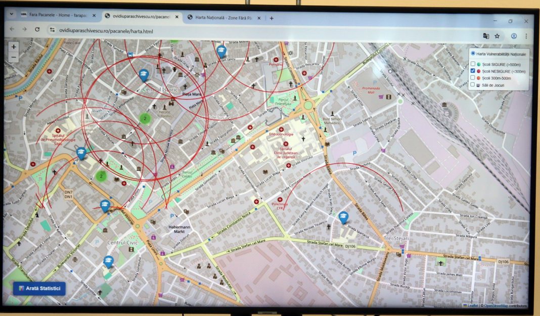 Aproape toate unitățile de învățământ din municipiul Sibiu se află la mai puțin de 500 de metri de o sală de jocuri de noroc, potrivit unei hărți interactive prezentate joi de USR Sibiu, în cadrul unei conferințe de presă.