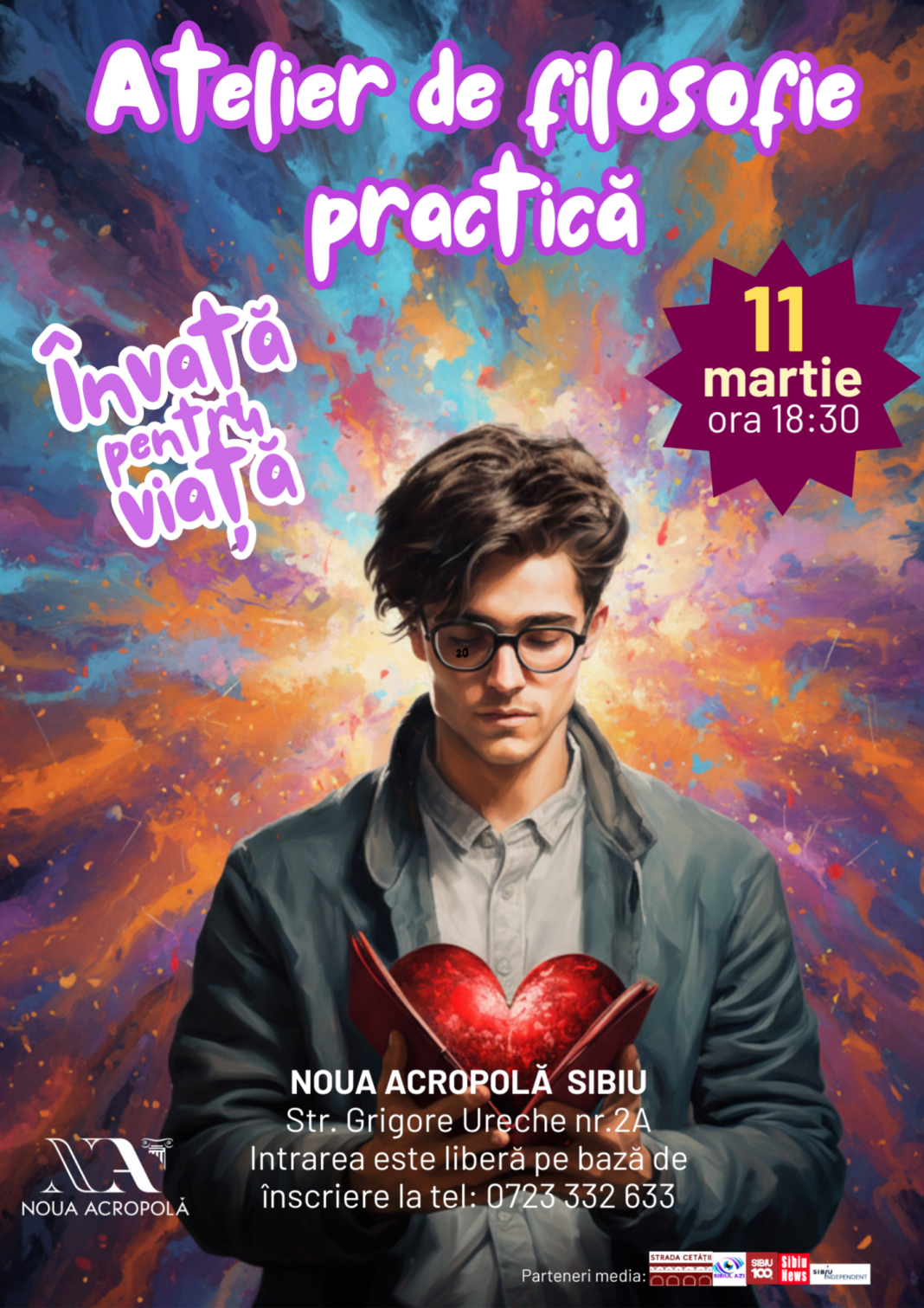 Sibienii interesați de dezvoltare personală și reflecție asupra propriei vieți sunt invitați miercuri, 11 martie 2026, de la ora 18:30, la atelierul de filosofie practică „Învață pentru viață!”, organizat de Noua Acropolă Sibiu, pe Strada Grigore Ureche nr. 2A.
