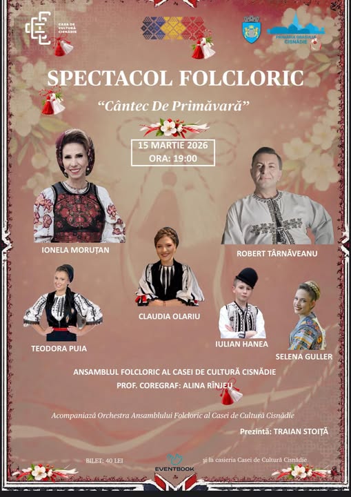 Primăria Orașului Cisnădie, prin Casa de Cultură Cisnădie, invită publicul la un eveniment dedicat tradițiilor românești și bucuriei primăverii. Spectacolul folcloric „Cântec de Primăvară” va avea loc duminică, 15 martie 2026, de la ora 19:00, la Casa de Cultură Cisnădie.