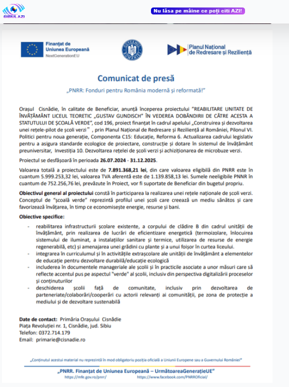 Proiectul de peste 7 milioane de lei pentru transformarea Liceului Teoretic „Gustav Gundisch” din Cisnădie în „Școală Verde”, finanțat prin PNRR, a avut un progres minim în perioada noiembrie 2024 – august 2025, potrivit unui raport oficial depus de Primăria Cisnădie la Ministerul Educației. Documentul, obținut de Sibiu Independent, arată că în aproape zece luni de la preluarea mandatului de către primarul Mircea Orlățan principalele activități realizate au fost publicarea unui comunicat de presă de început de proiect și contractarea proiectării tehnice.