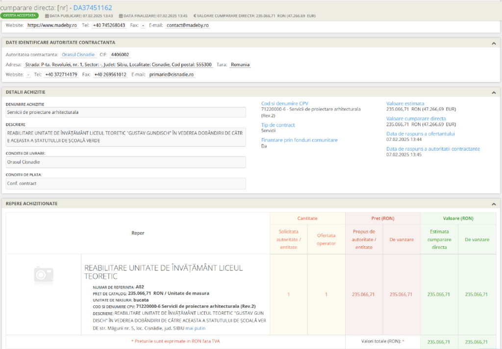 Potrivit raportului, singura activitate tehnică concretă realizată în perioada analizată a fost contractarea serviciilor de proiectare. Primăria Cisnădie a încheiat la 10 februarie 2025 contractul de servicii nr. 3702 cu firma MADEBY SRL din Cluj, pentru realizarea documentației tehnice în fazele DTAC și proiect tehnic.