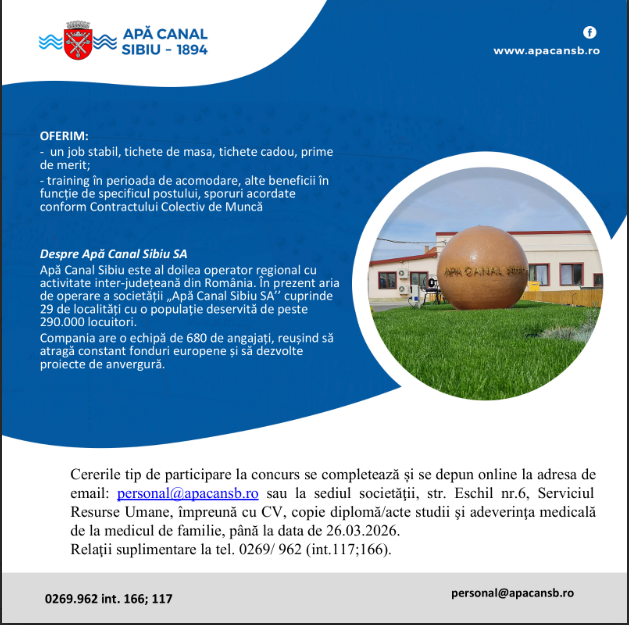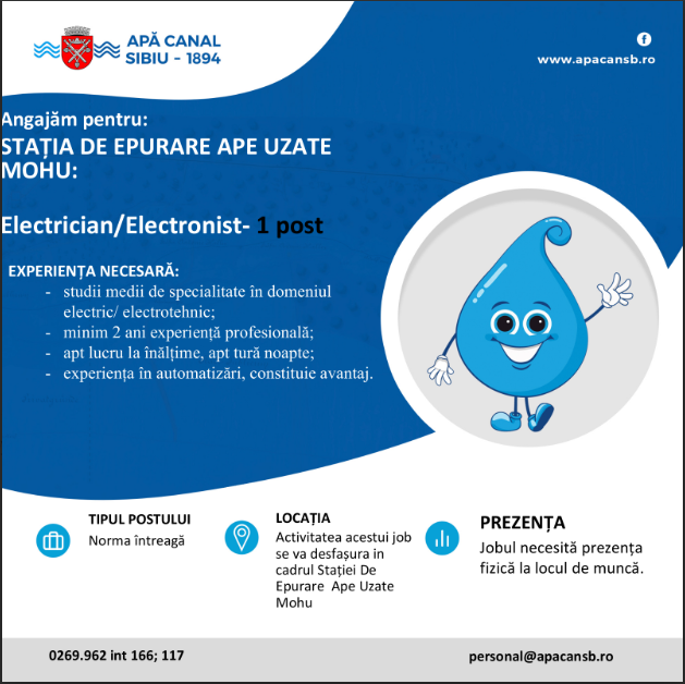 Societatea Apă Canal Sibiu S.A. a anunțat deschiderea unui post de electrician/electronist pentru Stația de Epurare a Apelor Uzate Mohu, în cadrul unei noi sesiuni de recrutare.