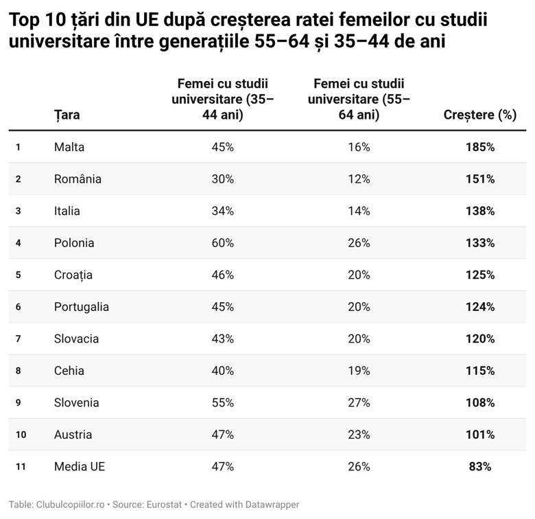 Analiza evidențiază și evoluția spectaculoasă din ultimele două decenii. La nivel național, ponderea femeilor cu studii superioare a crescut de la circa 12% la aproximativ 30%, ceea ce reprezintă un avans de aproximativ 151% — unul dintre cele mai mari din Uniunea Europeană.