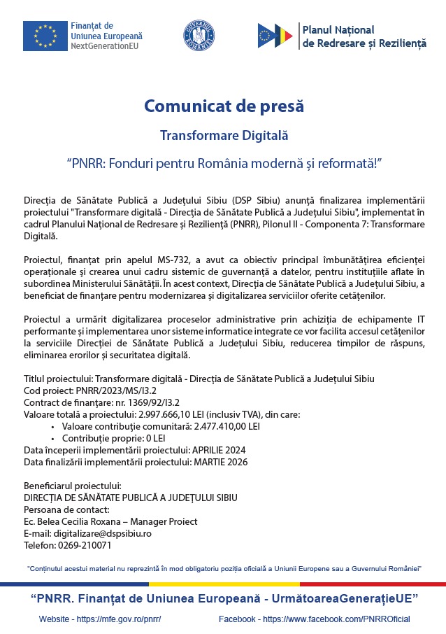 Comunicat de presă: Transformare Digitală – „PNRR: Fonduri pentru România modernă și reformată!”