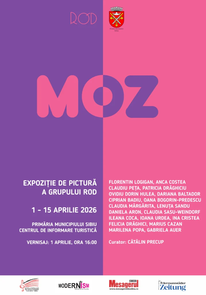 Grupul Rod, grup de artiști vizuali din Sibiu, deschide în perioada 1–15 aprilie expoziția de pictură „Moz”, găzduită în Sala de expoziții a Primăriei Municipiului Sibiu, în cadrul Centrului de Informare Turistică. Vernisajul va avea loc în 1 aprilie, de la ora 16.