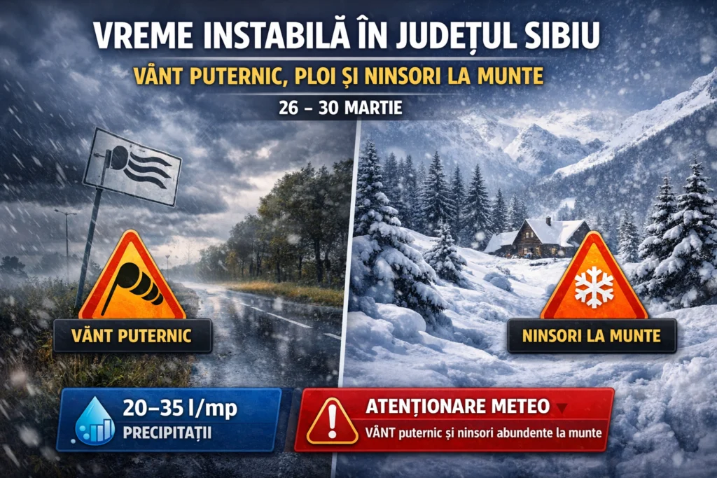 Județul Sibiu se va afla sub influența unei informări meteorologice emise de Administrația Națională de Meteorologie, valabilă în intervalul 26 martie, ora 12:00 – 30 martie, ora 10:00. Meteorologii anunță o perioadă cu vreme instabilă, caracterizată prin intensificări ale vântului, ploi moderate și ninsori în zona montană.